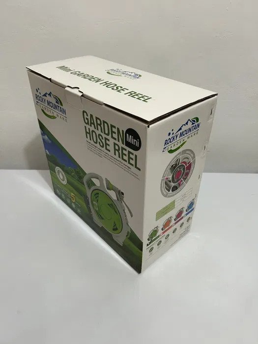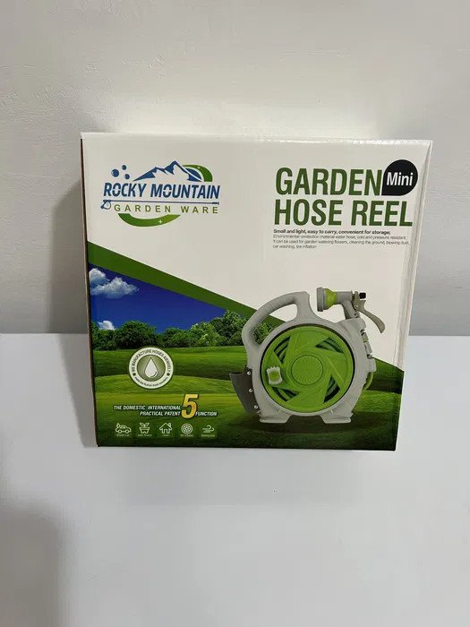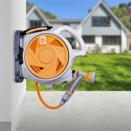 Une bonne sélection d'outils de jardin sous la forme d'un enrouleur de tuyau d'arrosage rétractable.